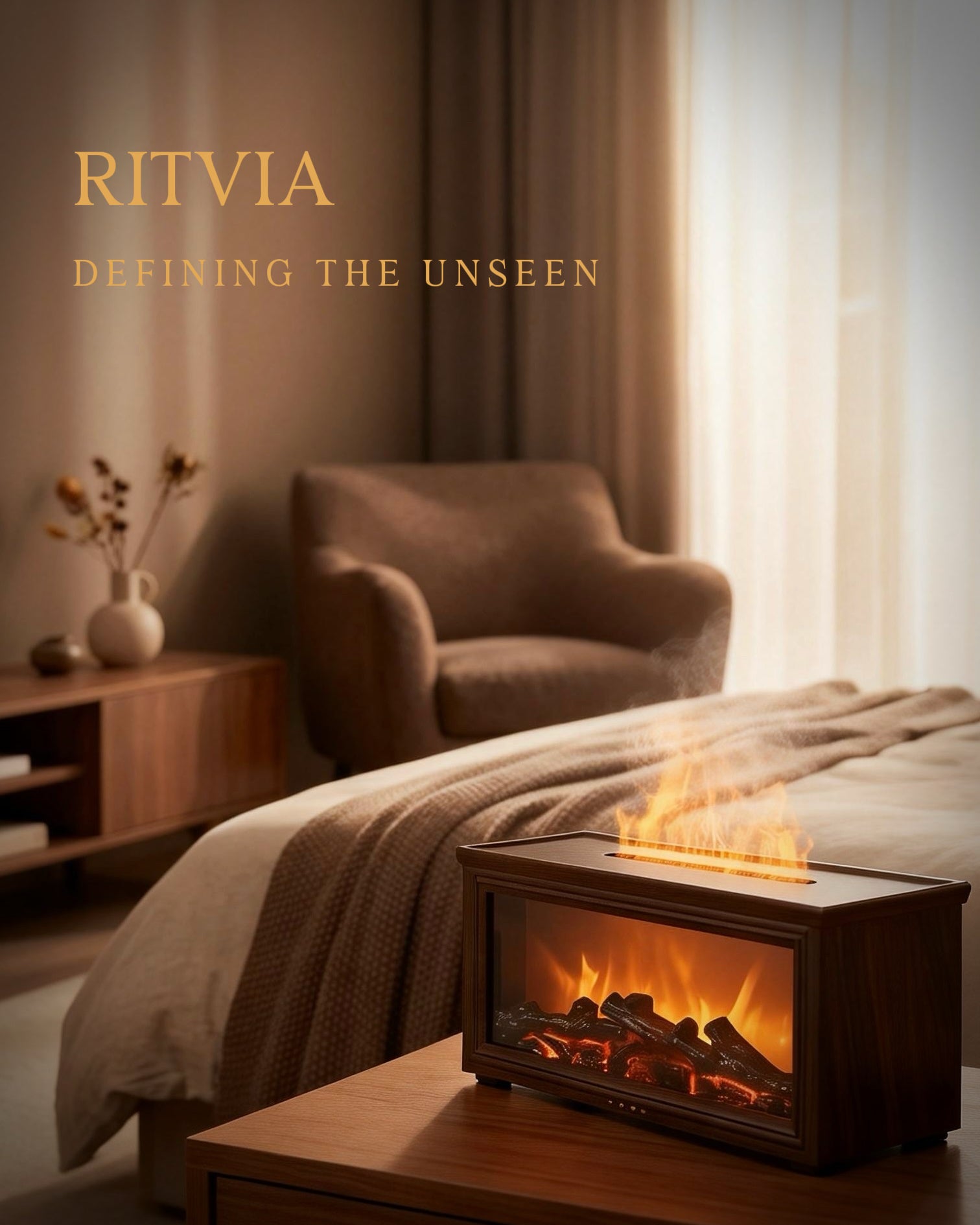 Wood as the hearth, fire turning into mist. Ritvia encapsulates the warmth of a fireplace within a singular, hearth-inspired vessel.
